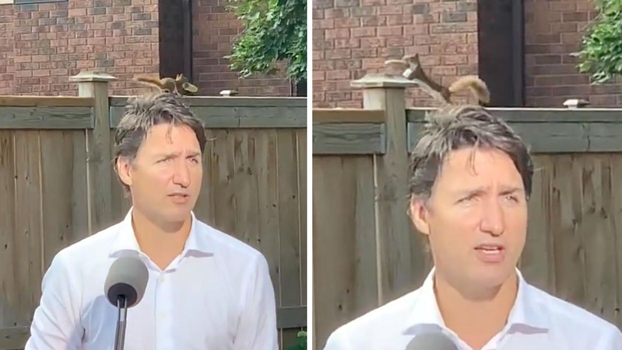 Justin Trudeau's campaign announcement got a little chaotic on Tuesday, when a skittish squirrel with a snack totally photobombed his speech.