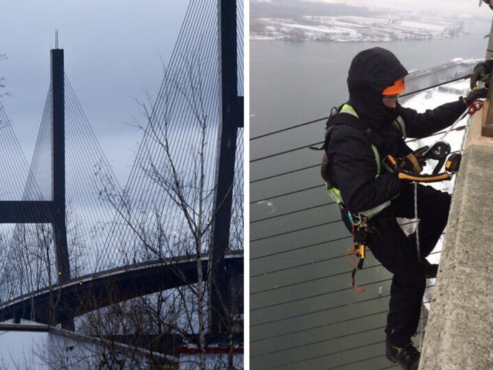 The ice bombs and snow accumulation on the Alex Fraser Bridge got so bad in the winter of 2016/2017, that they actually had to use a helicopter to blow the snow off the cables, according to a press release from the Government of B.C.