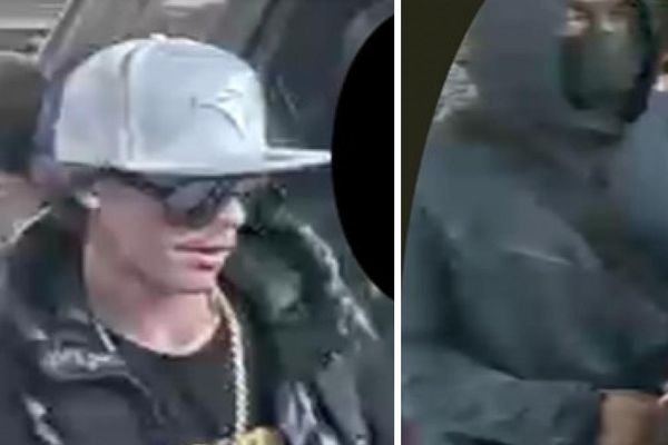 The second suspect, a white man, was last seen wearing a black jacket with a hood, a black mask, and a dark shirt with a design on the front. He also wore a gold chain with a pendant attached, a black backpack, and blue Nike shoes.