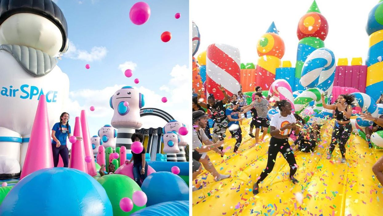 It features four giant inflatable attractions including a space-themed "wonderland" and the world's biggest bouncy castle.