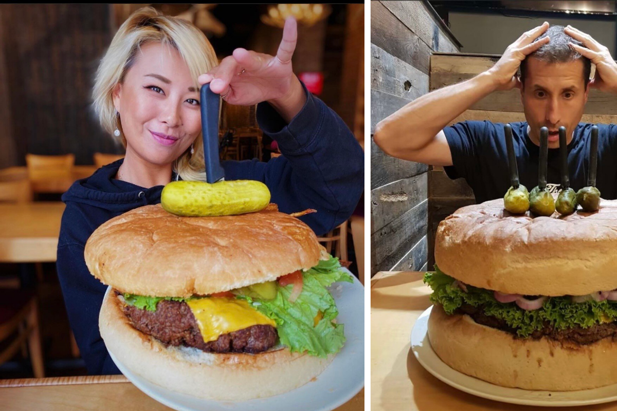 The challenge menu at this Canadian-themed eatery offers a choice of three different-sized burgers with patties that weigh four, six, or 12 pounds; no matter which one you undertake, the food ends up being free only if you complete it.