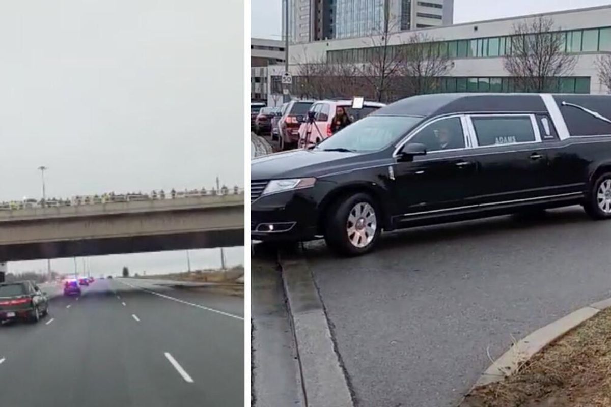 Highway overpasses and local streets were lined with people and police officers paying their respects as the procession made its way from the Centre of Forensic Sciences in Toronto starting at 9:00 a.m. and moved northbound to a funeral home in his hometown of Barrie, Ontario.