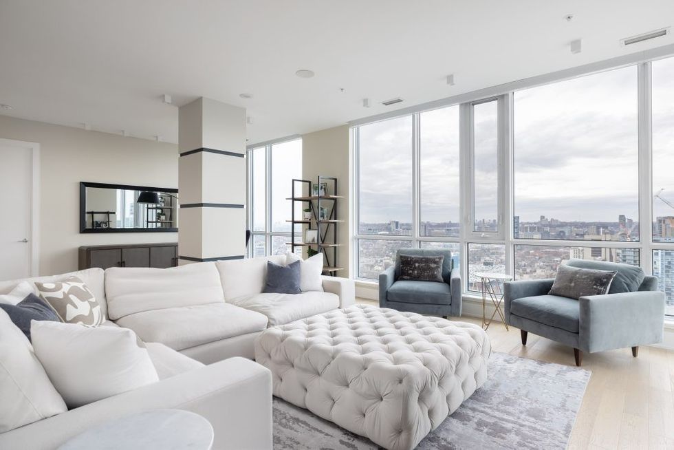 Floor-to-ceiling windows surround the home on three sides, flooding every room with natural light and providing sweeping views of the Toronto skyline.