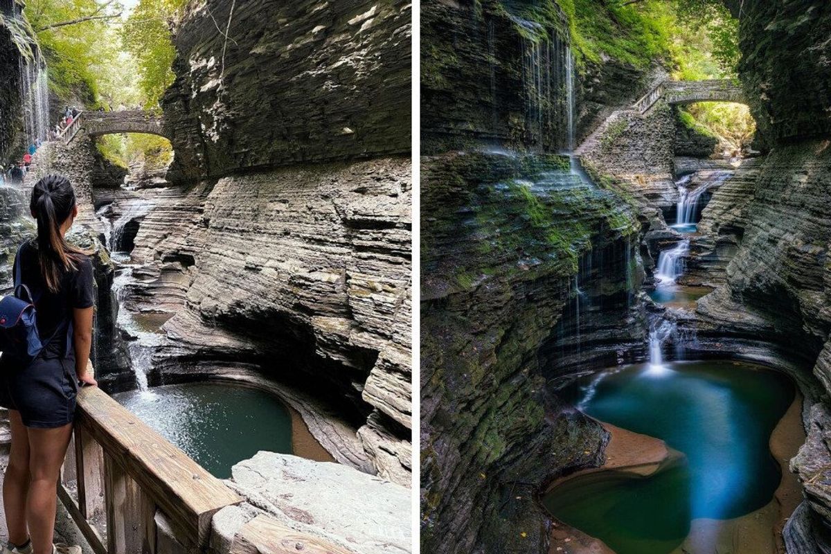 C'est au Watkins Glen State Park, dans l'État de New York aux États-Unis, que tu peux observer ce décor à couper le souffle en passant autant sous des cascades que sur des passerelles ainsi qu'en longeant les parois rocheuses.