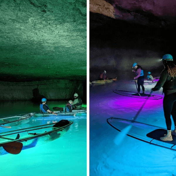 With SUP Kentucky's majestic Glow Tour in Red River Gorge, you will descend into the depths of an abandoned mining cave filled with crystal-clear water illuminated by LED lights in a clear-bottom kayak or paddleboard so you can see right through to the bottom.