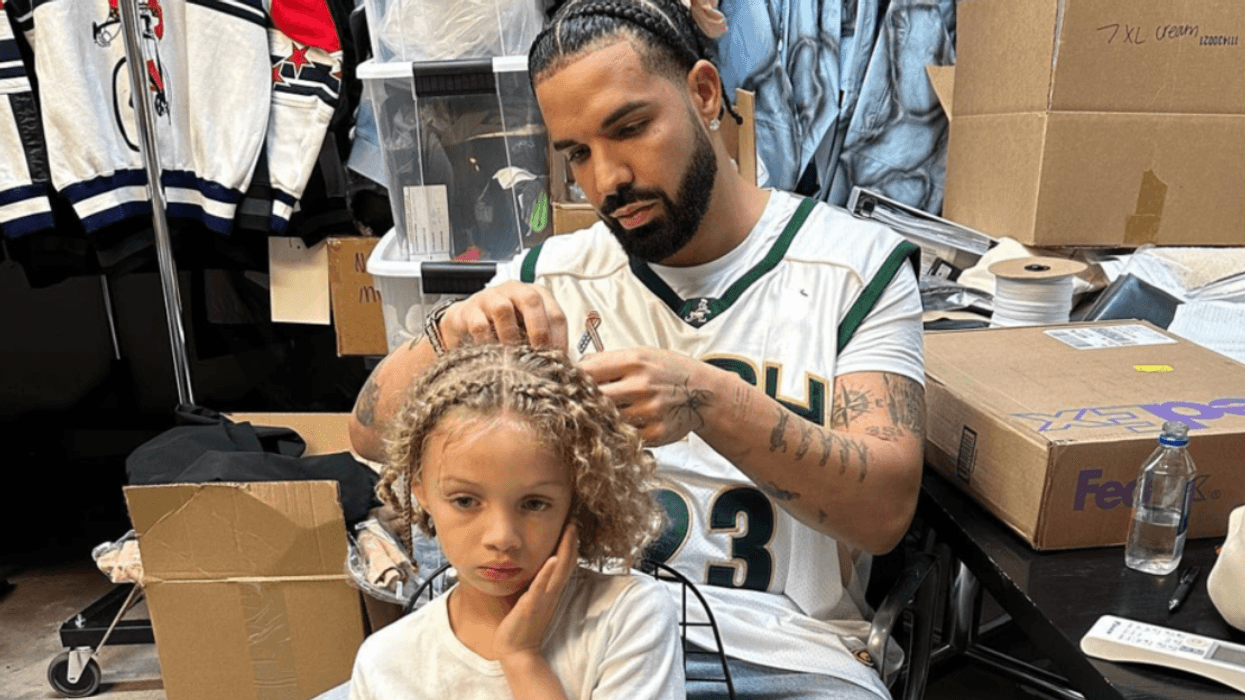 In an Instagram post, Adonis sits between Drake's legs, holding a basketball and seemingly zoning out as his dad braids his blonde curls into two braids on either side of his head, matching Drake's own hairstyle.
