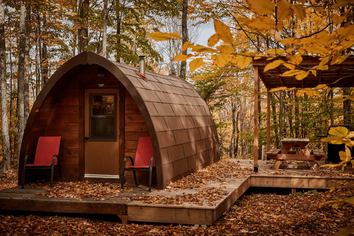 Pourquoi tu dois booker : Pour profiter d'un moment tranquille avec ton ou ta partenaire cet automne, il existe l'endroit idéal et il s'agit de la gare de Chêne Rouge, située à North Hatley. Ce lieu de glamping rustique niché au cœur d'une forê se trouve à seulement 15 minutes de Sherbrooke et à 1 h 30 de Montréal. La cabane en forme d'arche offre un grand lit confortable et une terrasse extérieure pour prendre vos repas et déguster des boissons.