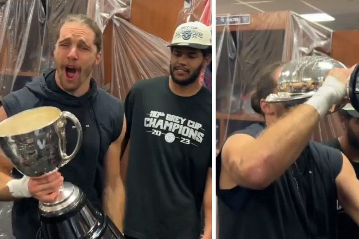 Après un match des plus serrés qui a fait vivre une montagne d'émotions aux partisan.es comme aux joueurs, les champions ont pu festoyer comme il se doit dans le vestiaire, et on peut dire que le champagne coulait à flots. Narcity Québec vous partage des images originales de Marc-Antoine Dequoy qui célèbre en grand en buvant dans la Coupe Grey.