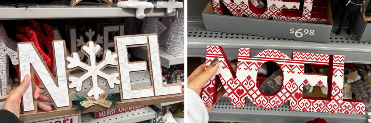 Les deux détaillants avaient de jolies options de bibelots énonçant le mot « Noël », mais avec des prix bien différents. Pour l'item rouge et blanc du Walmart, il faut débourser près de 7 $ plus taxes, tandis que le Dollarama offre des alternatives à 2 $ avant taxes.