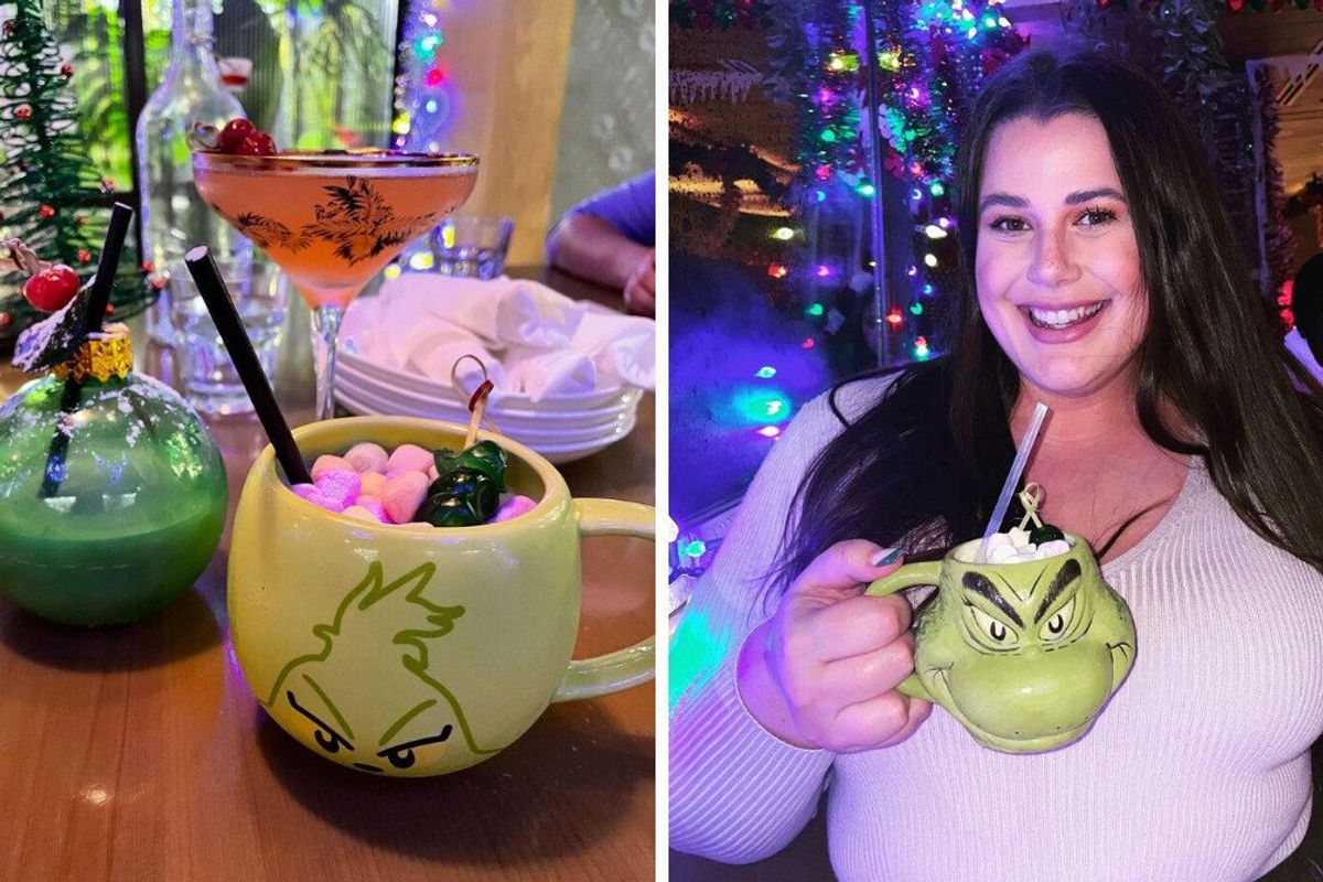 You can enjoy boozy drinks in Grinch and ornament-shaped cocktail mugs, such as Noggy and Nice and Sleigh, Queen, Sleigh.