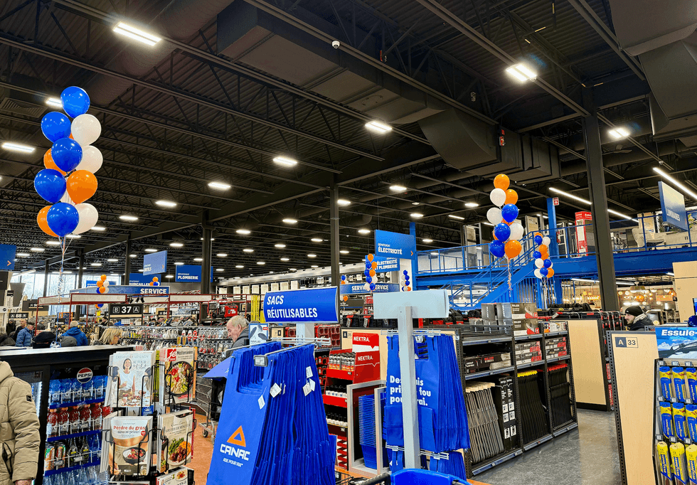 Dès l’entrée, l’accueil est chaleureux et l’excitation est palpable : des ballons aux couleurs de Canac un peu partout, des membres du personnel qui distribuent de petits cadeaux à l’effigie de la marque, comme des bouteilles réutilisables, des mini-gallons à mesurer ou encore des carnets et des crayons, contribuent à l’ambiance festive. Au cours du week-end, il y a un concours et quelques petites surprises du genre pour les premiers client.e.s.
